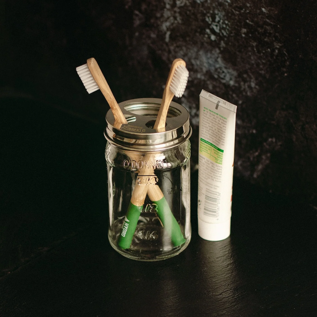 Mit den hochwertigen Aufsätzen aus Edelstahl von O'Donnell Moonshine kannst du deinen leeren Mason Jars ganz neue Aufgaben geben! Mach sie zu einem neuen Platz für Zahnbürste und Zahnpasta!